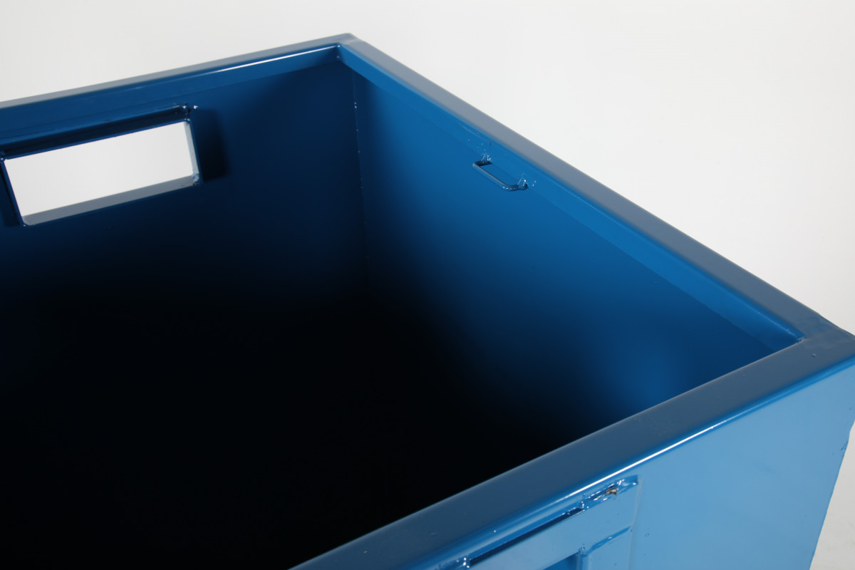Bottentömmande container 1000 L med 800 kg kapacitet. Pulverlackerad, staplingsbar och utrustad med automatisk öppning och låsning. Lock finns som tillval (art.nr. 2511018189).