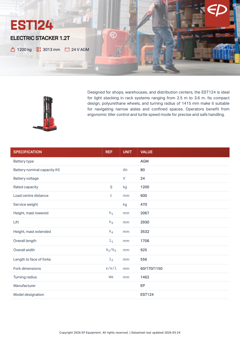 EP Elektrisk Ledstaplare / Truck EST124 – AGM, 1200 kg