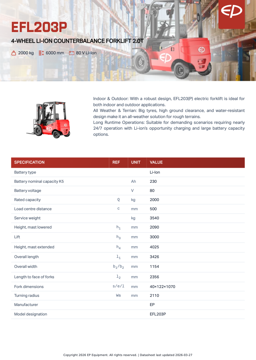 EFL203P är en elektrisk motviktstruck / gaffeltruck framtagen för verksamheter som kräver hög drifttid, robust konstruktion och maximal flexibilitet. Med en lyftkapacitet på 2000 kg och möjlighet till stora batterikonfigurationer är den idealisk för lager, industri, bygg och tung internlogistik.