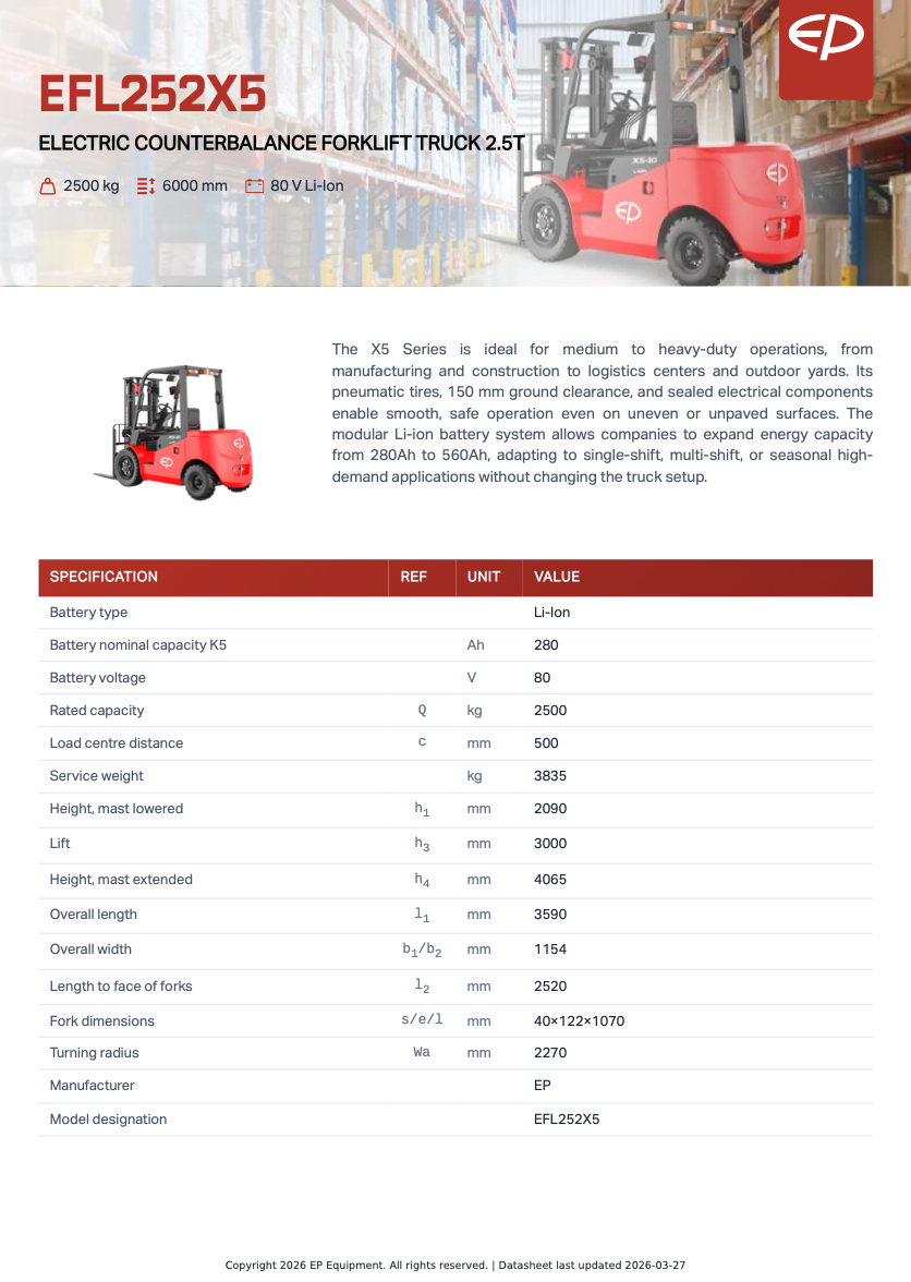 EFL252X5 är en elektrisk motviktstruck / gaffeltruck utvecklad för verksamheter som kräver hög prestanda, flexibilitet och driftsäkerhet. Med en lyftkapacitet på 2500 kg och robust konstruktion är den idealisk för tillverkning, bygg, logistikcenter och utomhusarbete där underlaget varierar.