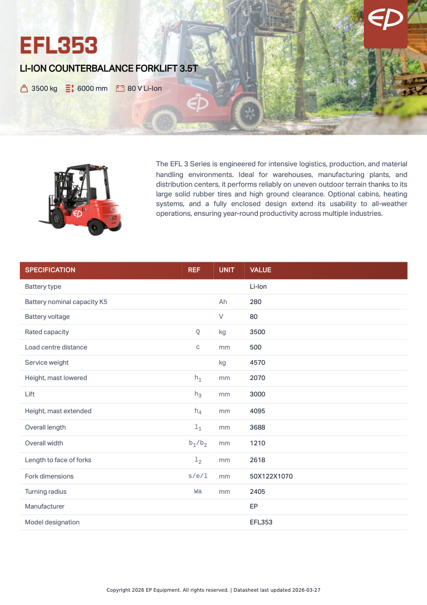 EFL353 är en elektrisk motviktstruck / gaffeltruck framtagen för verksamheter som kräver hög prestanda, driftsäkerhet och flexibilitet i både inom- och utomhusmiljöer. Med en lyftkapacitet på 3500 kg är den idealisk för lager, tillverkningsindustri, logistikcenter och tung materialhantering.