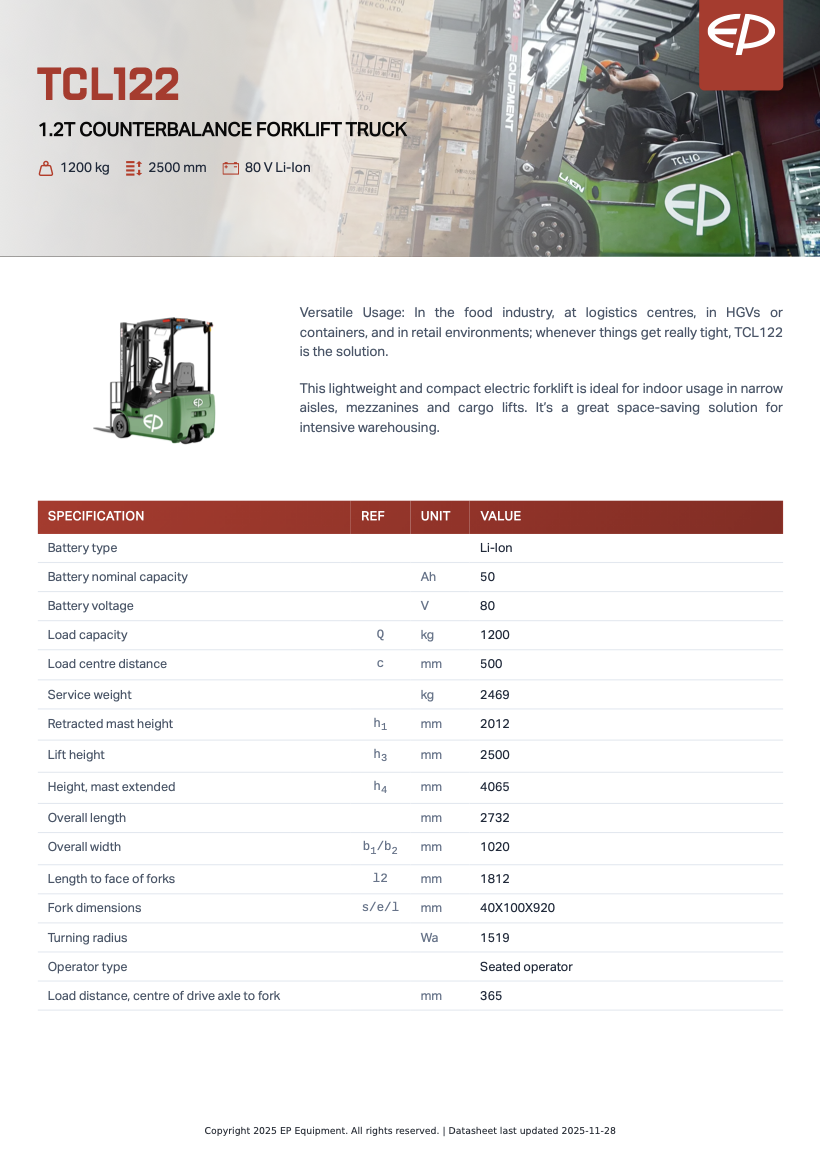 EP Motviktstruck TCL121 – Kompakt, kraftfull och optimerad för 1 200 kg