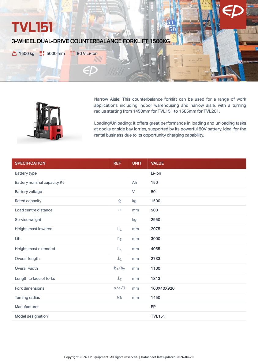 EP Elektrisk Motviktstruck TVL151 – Litium, 1500 kg, 3-hjul