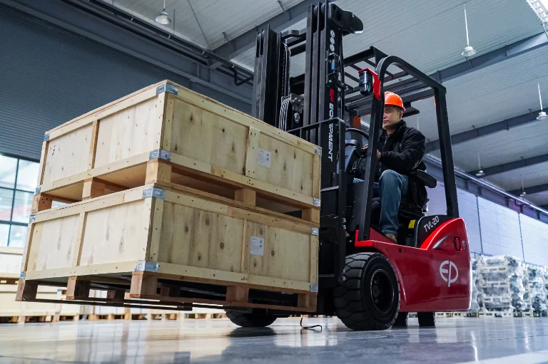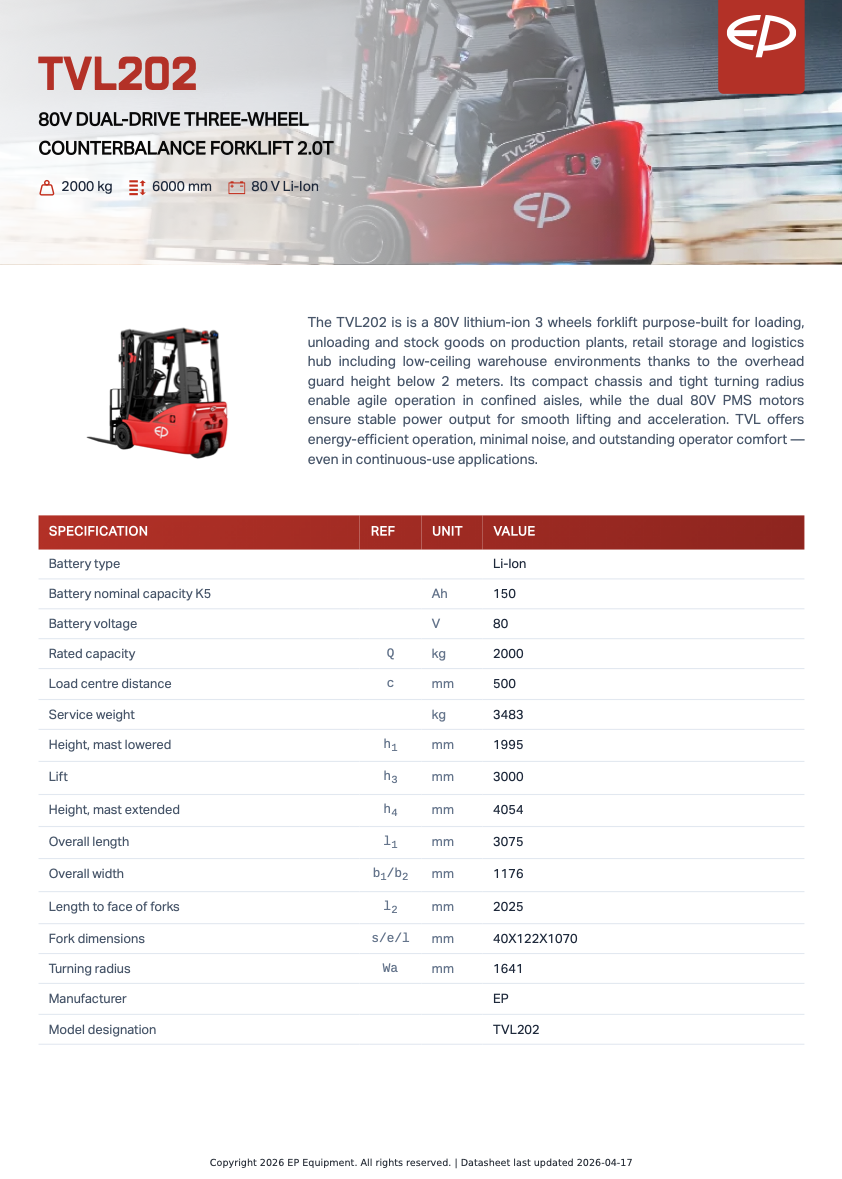 Kontakta för offert. EP TVL202 är en kompakt 3-hjulig elektrisk motviktstruck (gaffeltruck) med 80V litiumbatteri, 2000 kg lyftkapacitet och upp till 6000 mm lyfthöjd, utvecklad för effektiv truckkörning i trånga lager, låg takhöjd och logistikmiljöer. Med dual drive, mycket kompakt chassi och bygghöjd under 2 meter är den optimal för lager, containerhantering och produktion.