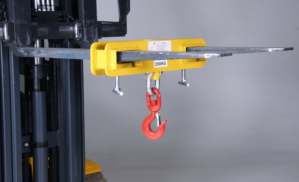 Lyftblock – kapacitet 2,5 ton för truckgafflar. Omvandlar snabbt trucken till mobil kran med justerbar position, säker krok och skruvhandtag för trygg och enkel hantering.