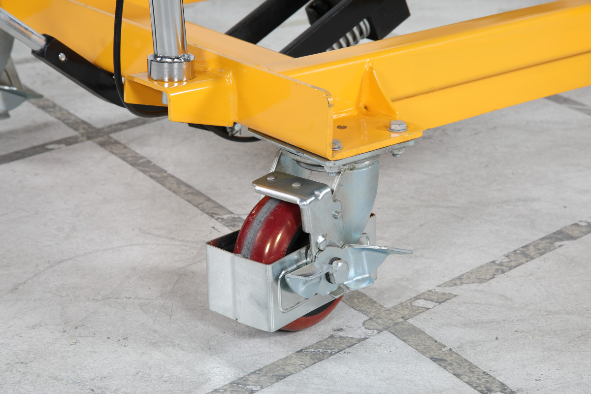 Vagnen har två fasta hjul och två länkhjul – alla med fotskydd – vilket gör det lätt att manövrera lyftbordet samtidigt som säkerheten bevaras. Perfekt för lager, verkstäder eller andra arbetsplatser där säker hantering av tungt gods är en del av vardagen.