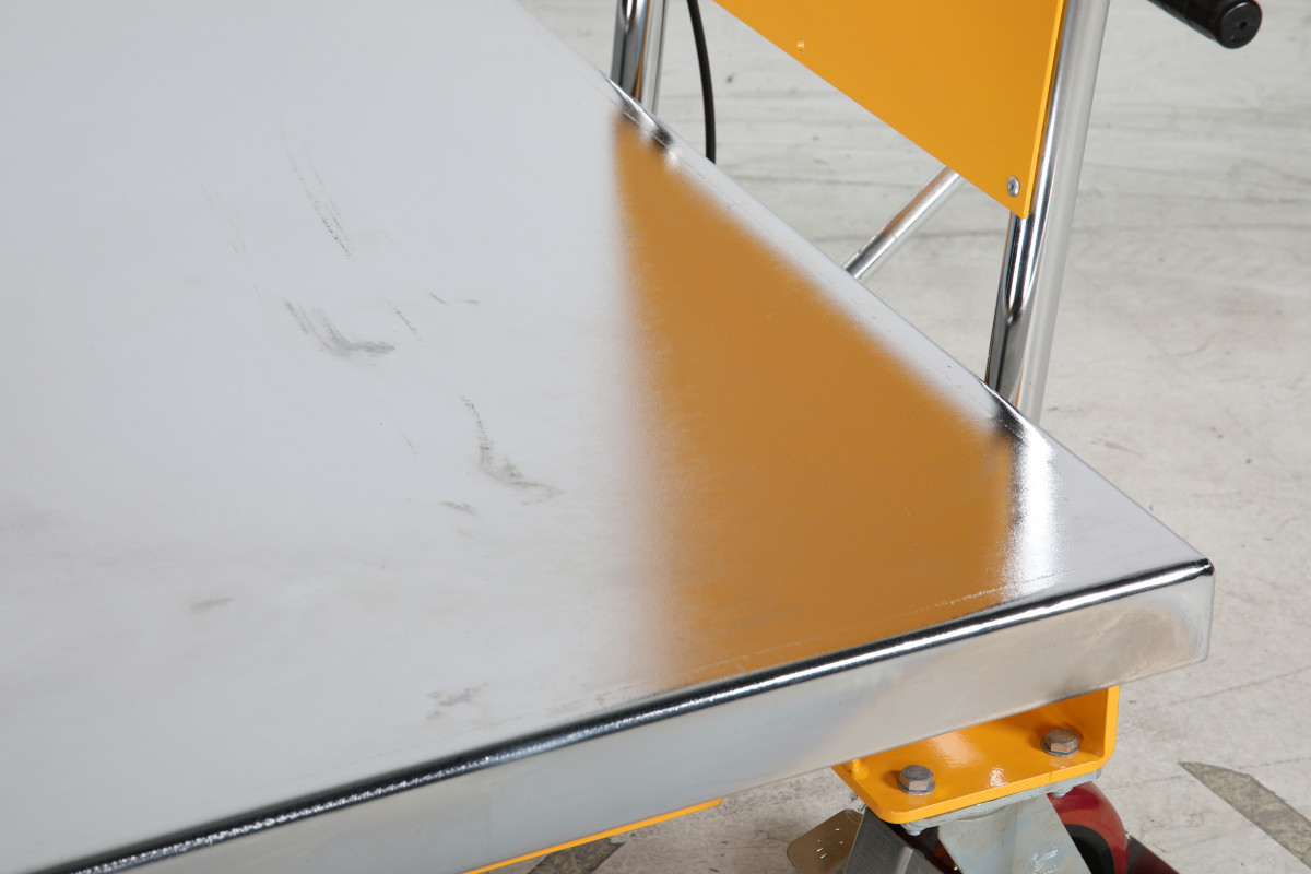 SP500B är utrustat med ett stabilt, fast handtag som ger god kontroll vid förflyttning. Den elförzinkade lastplattan ger motståndskraft mot rost, vilket förlänger bordets livslängd även i krävande miljöer.
